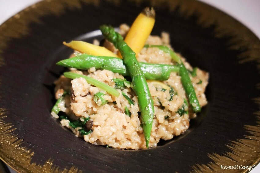 這道泰式椰漿燉飯非常特別,使用的是泰國長米和當季時蔬,搭配了義大利牛肝菌和牛肝菌肉骨茶,味道非常豐富