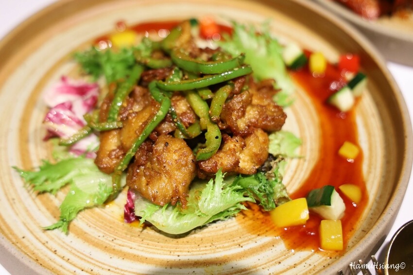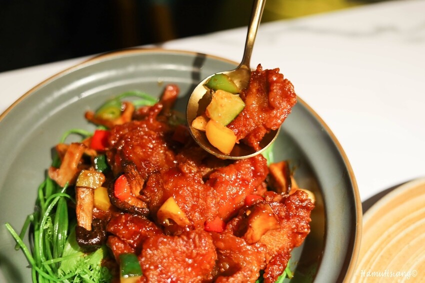 素食版的大馬酸甜魚是一道非常特別的料理,使用的是素炸魚、彩椒和檸檬,搭配店家自製的酸甜醬和水蓮。