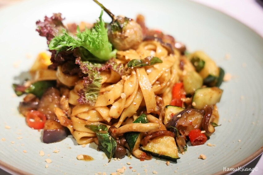 這道泰式馬鈴薯燉肉寬扁麵的口感非常豐富,不僅有自製的素馬鈴薯絞肉和咖哩葉的香氣,