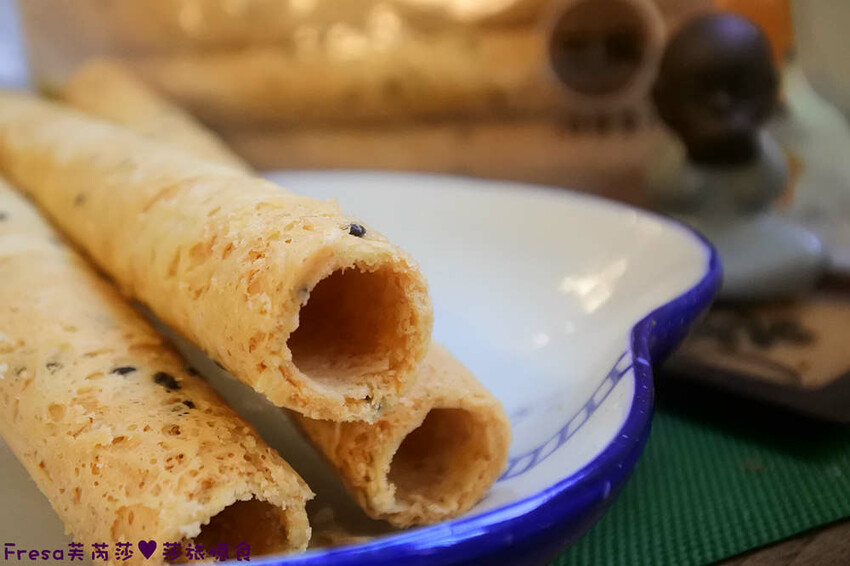 它的脆度和蛋捲不一樣,輕脆薄鬆的口感.