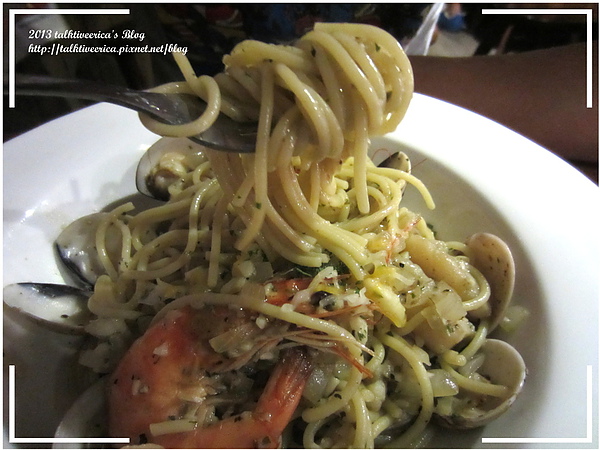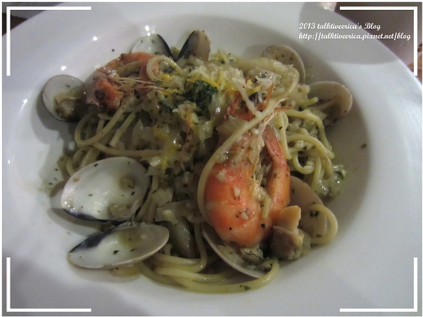 用香蒜調味的義大麵,搭配有鮮蝦與蛤蜊的海鮮料