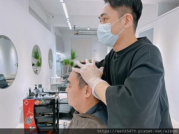 設計師考量屎蛋爸的需求,進行髮量的修剪!