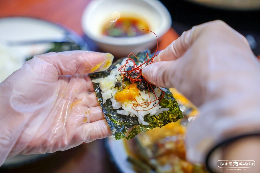 同樣有店員桌邊服務,見她熟練的將米飯、蟹膏和松露依照比例包覆在海苔中,像握壽司的吃法,入口滿載新鮮。