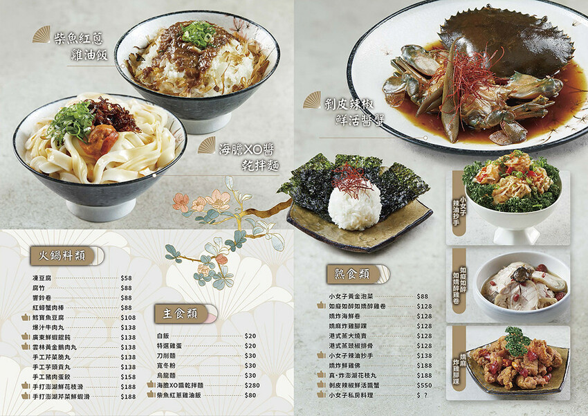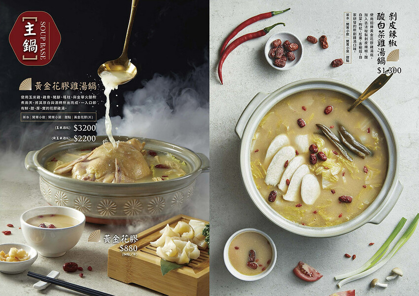 火鍋湯底有黃金花膠雞湯鍋,分成豪華雞肉版和雞湯無肉版兩種選擇,點鍋附贈開胃小菜、黃金花膠一盤和甜點,也有剝皮辣椒酸白菜雞湯鍋選擇。