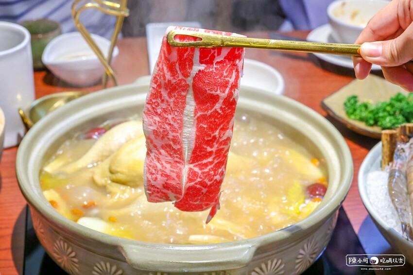 肉質軟嫩無骨牛小排,涮至五分鐘的粉嫩模樣就可以開動了!肉片吸附雞湯不用沾醬,直接吃原味就很好吃。