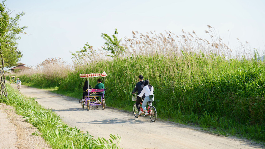 順天灣赤足步道旁邊可以租借協力車,在蘆葦林中騎行穿梭。