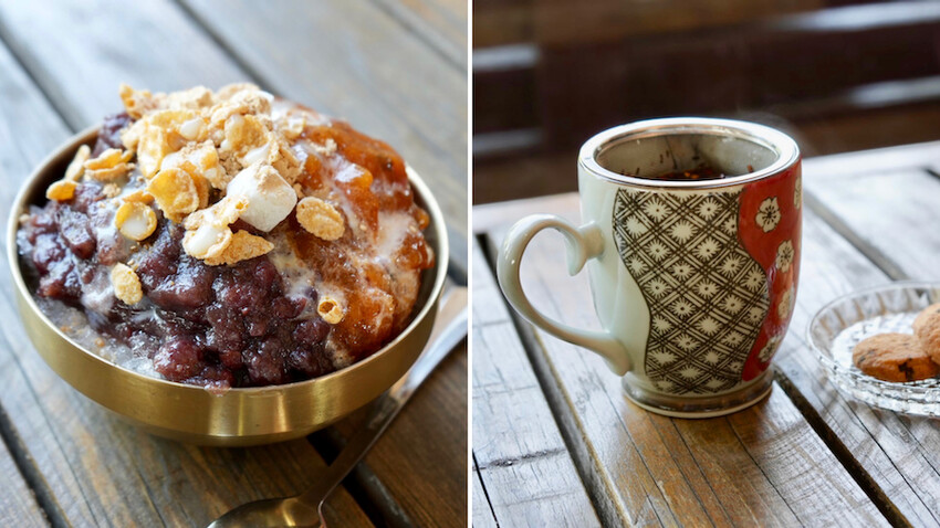 (左邊)必吃的柿子紅豆剉冰/(右邊)韓國養氣茶
