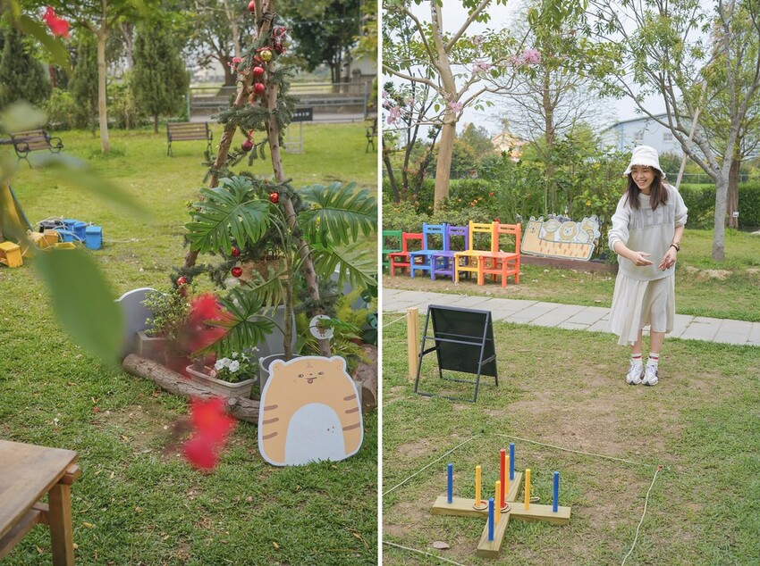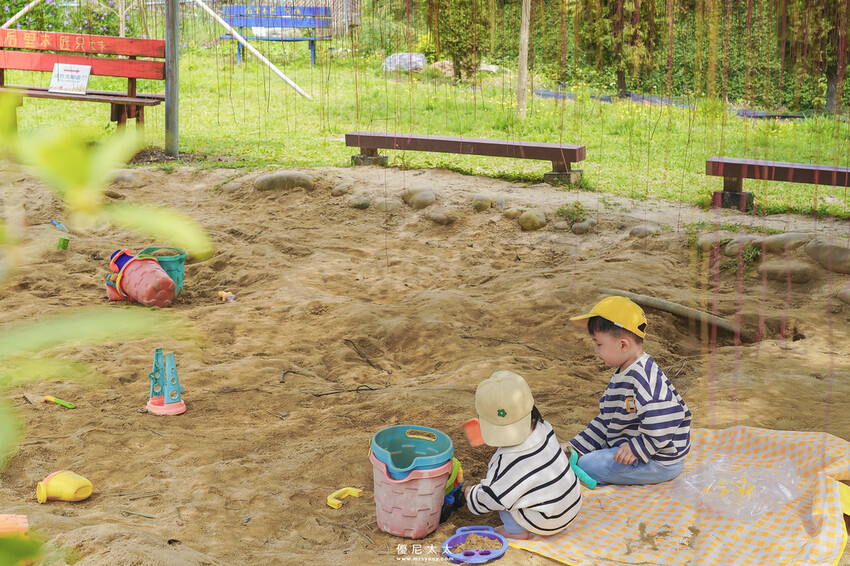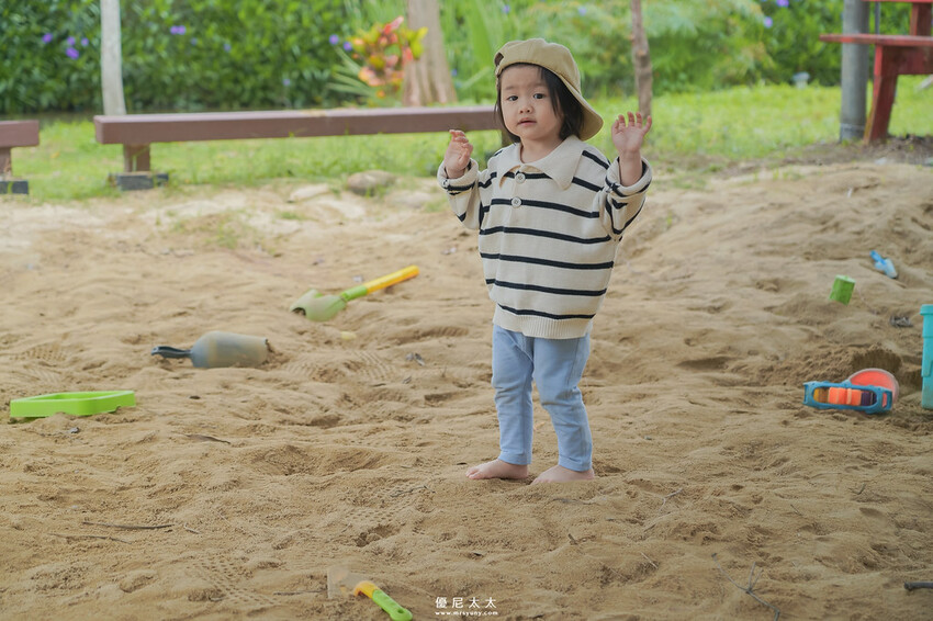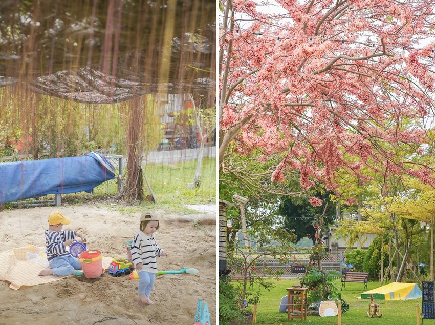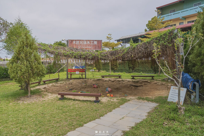 戶外沙坑也是個明星“玩區”!孩子看到沙坑根本瘋掉,嚷嚷的要衝進去玩耍!這裡的沙坑已經有基本的玩沙玩具,上方還有簡易的遮陽網可遮去些炎炎夏日的烈陽,我自己是自行攜帶野餐墊,讓小朋友直接坐在墊子上玩耍也不會染上一身沙,另外,目前沙坑旁邊也設置了『洗腳台』,家長們在清潔上也比較方便。這些後花園木作童玩和戶外沙坑的設施不僅讓小朋友可以玩得開心,也讓家長可以放心讓孩子在這裡玩耍。因為這些童玩和花圃都是由木匠兄妹木工房的老師親手打造成而成,有著許多設計上的巧思及手感溫度。如果你來到這裡,一定要帶著小朋友來後花園玩玩看喔!