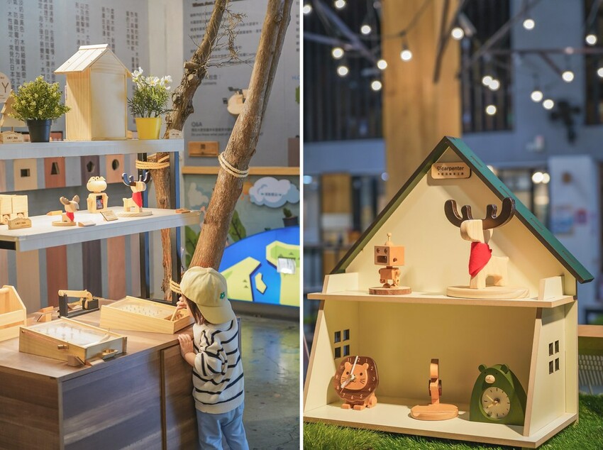 和許多木工廠不一樣,木匠兄妹木工房把傳統木工延伸到生活中的各種小物,讓以往單純的木工作品,注入新的設計氣息,例如聯名的木造居家小物、股東禮、室內蔬菜製造機等等,儼然和我們之前想像的傳統木工廠不一樣。另外,現場安置了許多木造玩具供小朋友遊玩,包含木質橡皮筋槍、彈珠台、軌道,賽車等等,通通都是由工廠的老師一手操刀設計,彷彿就像來到親子館一樣(笑)。