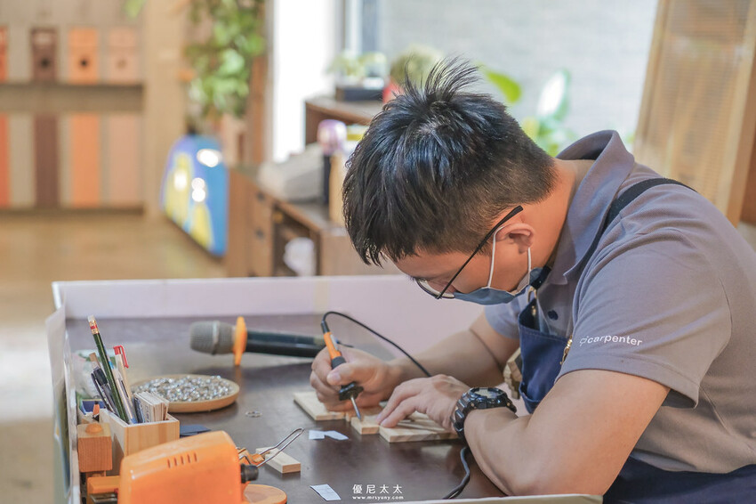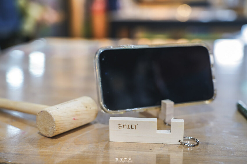 這次是因為使用『台中暢遊套票』,所以兌換了現場DIY製作『Hold得住手機架』,DIY手機架的步驟非常簡單,只需要用砂磨機將木塊砂磨平滑,然後用電鑽在木塊上鑽一個鑰匙環孔洞,最後就可以在手機架上進行自由的彩繪了。整個過程中老師會在旁邊指導,即使是操作聲音比較大的電鑽機器,只要小心操作就不會有任何危險。之後便可以在手機架上盡情彩繪,最後老師還非常好心的幫小朋友刻字在上方,完成這個客製化手機架。