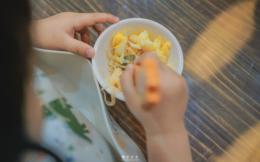 如此需要高度技巧的紙捲麵,換到我們身上,彷彿時間靜止,我們動作變得超慢(笑),跟著老師緩慢的學習,一步步教學讓我們也能捲出這個美麗的古法紙捲麵,雖然技術不佳,但至少自己動手完成的作品及其可貴。至於小小孩的部分,4歲的睿睿還有老師會在旁邊教學,但2歲的菲菲就無法體驗,坐在旁邊玩麵條(笑)!