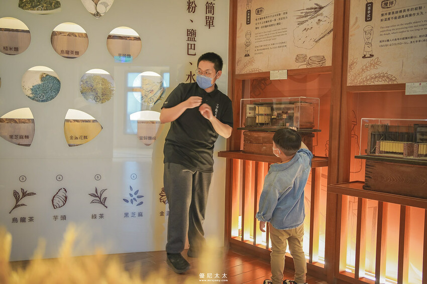 在製作紙捲麵前,有10分鐘的講解,由導覽老師依依介紹製麵程序及創辦人辛勞製麵的歷史