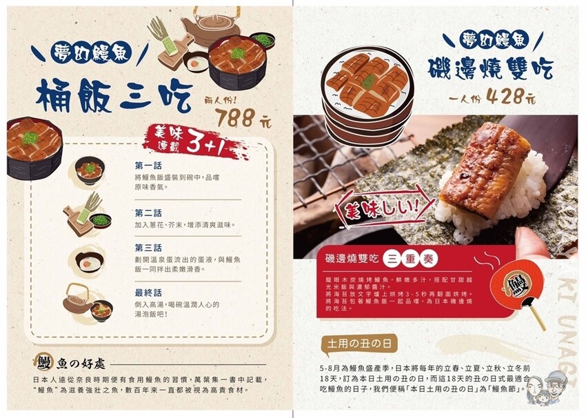 鰻屋主打經典鰻魚料理鰻魚桶飯 3+1 吃、鰻魚桶飯雙吃磯邊燒、溫玉蔥花鰻魚丼等,