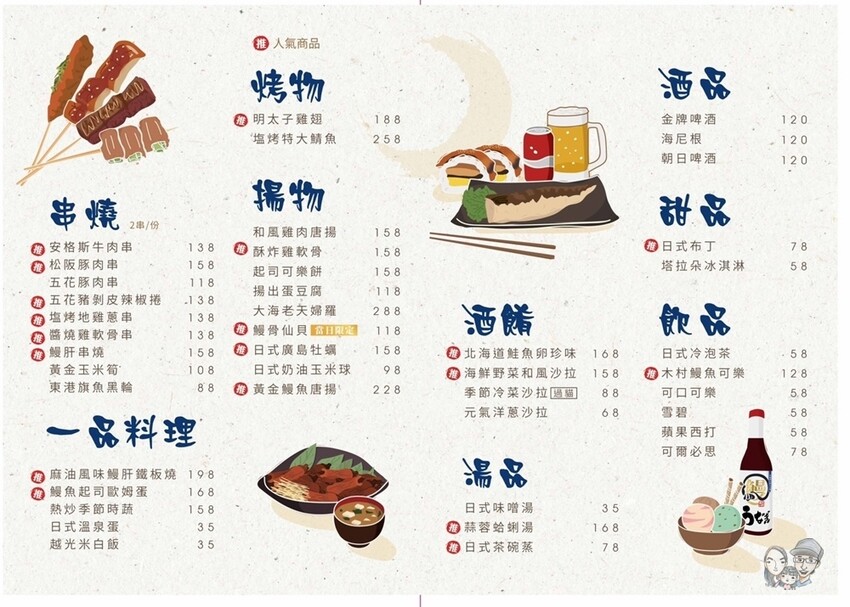 可以單點串燒、一品料理、烤物、揚物、酒餚、湯品、酒品、甜品和飲品等,
