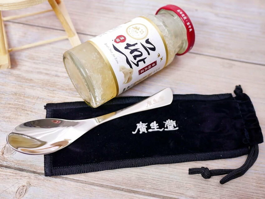 廣生堂 濃縮冰糖燕窩打開後可以看見濃縮冰糖燕窩以及絨布袋裝著的湯匙.方便大家食用