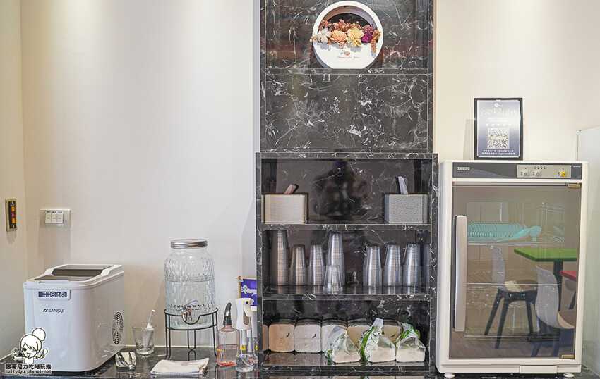 餐具自取,還有免費的冰塊、茶水可使用,旁邊還有付費的35元飲品