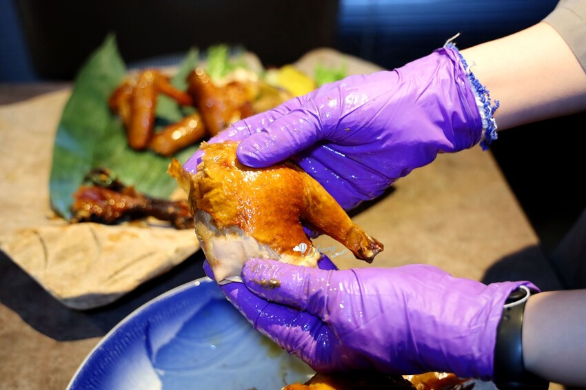 這隻脆皮雞在分解的過程中,一直流下了滿滿的湯汁,而且整個雞肉都呈現水嫰的模樣,我們不禁嚥了一下口水!