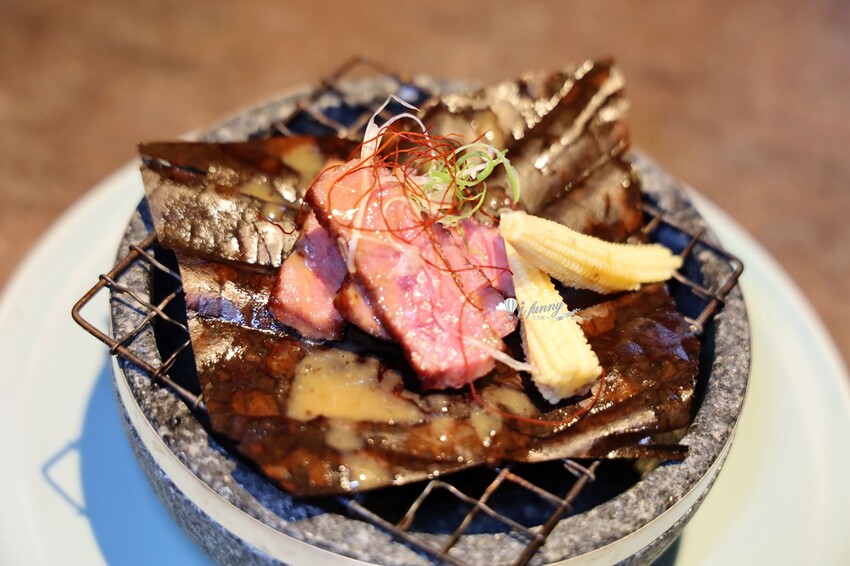 在底下的器皿中放上了保溫的石頭,可使牛小排的溫度不流失。
