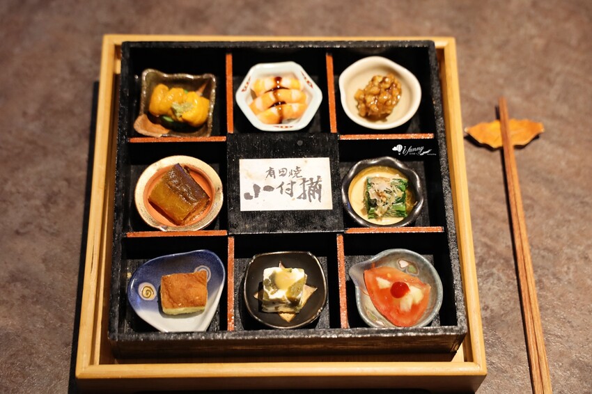 這包含了的九款前菜:分別是胡麻菠菜捲、蕃茄蘋果晶凍佐梅子醋、皮蛋乳酪佐味噌醬、玉子厚蛋燒、紫蘇香魚、海膽小黃瓜、鮮蝦及蜜核桃。其中濃厚的蜜核桃很像甜點,建議最後再食用。