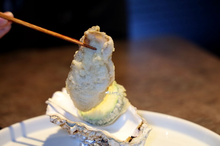 碩大肥美的的生蠔,裹上薄粉炸過,一旁搭配的是天婦羅櫛瓜。