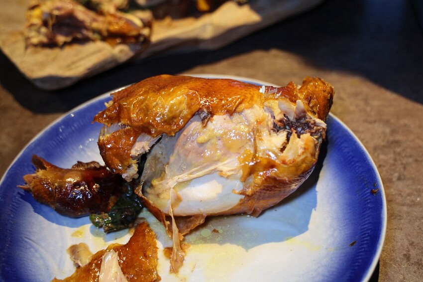 甚至本來放在雞隻裡頭的大蒜、刺蔥等也都拿出來了!裹附了滿滿胡椒,蒜頭已經不嗆辣,口感綿密。就連刺蔥也是非常地美味!