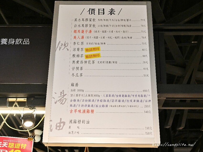 雞膳之家的品項非常多樣化,有白木耳飲、黑木耳飲、杏仁茶、美人湯等,還有滴雞精及養生湯,除了零售外,也有販售禮盒唷