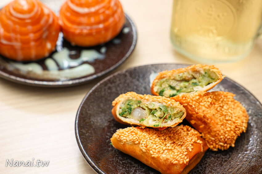 這道酥皮海鮮卷也很美賣,嚴選芝麻酥皮再夾入滿滿韭菜、鮮蝦入餡,一口咬下滿滿鮮味與韭菜味在嘴裡蹦開,層次相當豐富,然而香脆的黃金酥皮十分爽脆,整體吃起來不會太油膩。