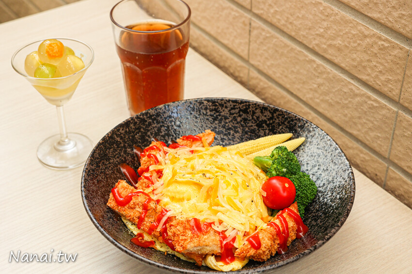 日式豬排螺旋禮服蛋包飯是店裡必點人氣招牌,餐點除了主餐外,有附甜點和紅茶,若喜歡重口味可加購20元起司。話說他的份量比我想像中還要多,用料毫不手軟,光是裏頭的茄汁炒飯滿滿一大碗,對於大食量的我都能飽到不要不要,除此之外還有玉米、花椰菜、小番茄陪襯唷。