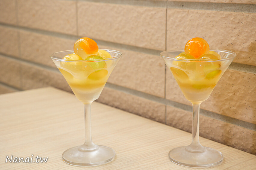 吃飽喝足後竟然還有附甜點,當老闆娘端出手作水果蒟蒻球時非常吸睛,一顆顆的水晶球倘落於高腳杯中,小巧可愛又滾滾的外型讓人捨不得吃。後來小聊一下才知道原來是老闆娘親手製作,嚴選新鮮水果加上蜂蜜、檸檬汁製成水果蒟蒻球,輕輕一咬享受彈Q感在口腔裡跳躍的滋味,咀嚼時竟然吃的到不同水果肉,口感則是酸甜中帶清爽滋味,吃完特別解膩。