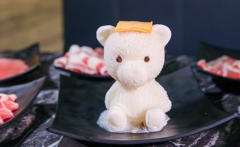 小熊泡溫泉好可愛,雖然這也不是他們第一個用的梗,要我沒記錯四五年前,在日本的火鍋店就見過。但心心麻辣鍋在小熊頭上放了起司毛巾又加分不少。