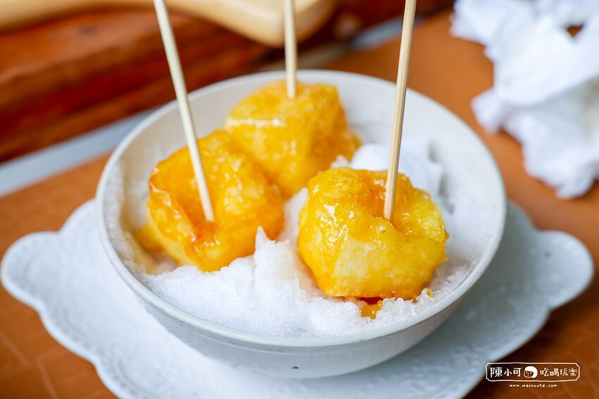 店主提醒要快點吃的甜點,外層是脆脆的糖衣,裡面則是帶點餘溫、口感綿密的小米麻糬,非常好吃呢!很像拔絲地瓜的風貌。