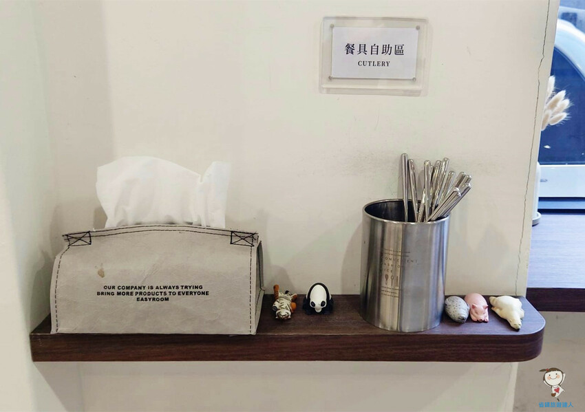 餐具自取區,除了湯匙,還有一個非常文青的面紙盒和動物小擺飾