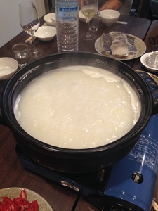 平常我不愛吃粥,但是這個港式雞粥真的太厲害了,想必是經過長時間的熬煮才能有這樣的好滋味,這可是我第一次用粥來煮沙公,甜美到一個極致,太神奇了,這個沙田雞粥一鍋6000元,可以找8到10個好友們或家人一起來享用就會剛剛好,老板準備的食材其實已經份量與誠意十足,都是他早上才採買的新鮮貨呦!好友又加碼,讓我們一開始搶食的盛況持續不到一小時,大家就飽到四目放空相望了,秋粥滋補之好幸福豬肝也好吃到讓人感動透抽好軟Q丸子裡臥虎藏龍熱呼呼的粥上再淋上這個辣蘿蔔乾我的媽媽咪啊~~也太好吃了