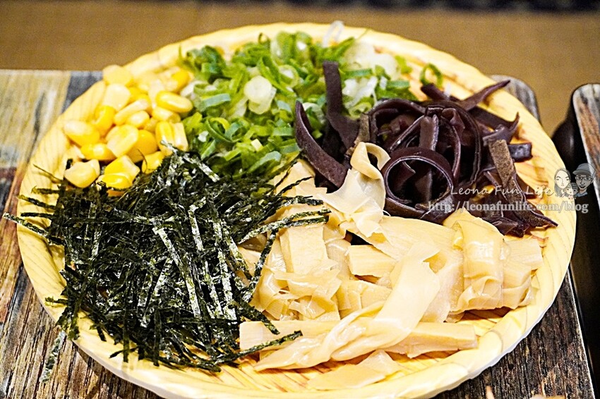 16種拉麵配料有提供蔥花、黑木耳、豆芽、海苔絲、筍干、溏心蛋半顆、蒜泥、叉燒3片、玉米筍、小白菜、高麗菜、豆皮、蓮藕片、玉米粒、青江菜與紅辣椒油,