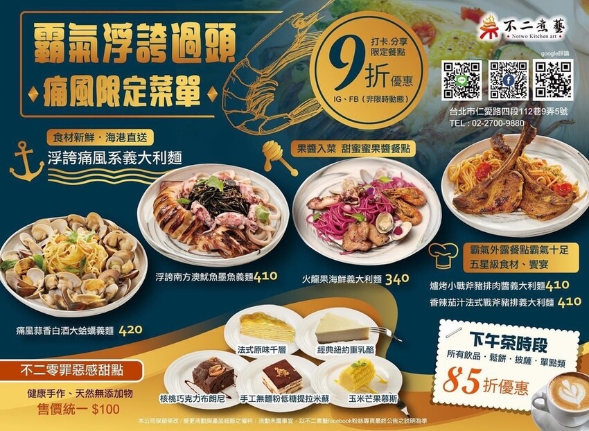 - A套餐(+$100):$80飲品or主廚例湯、生菜沙拉、麵包