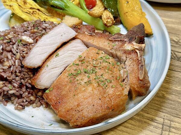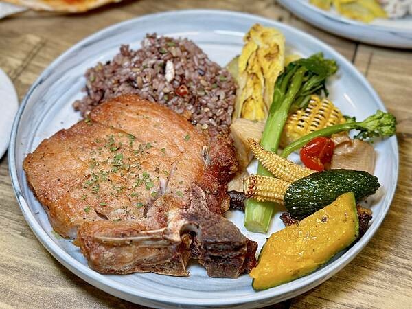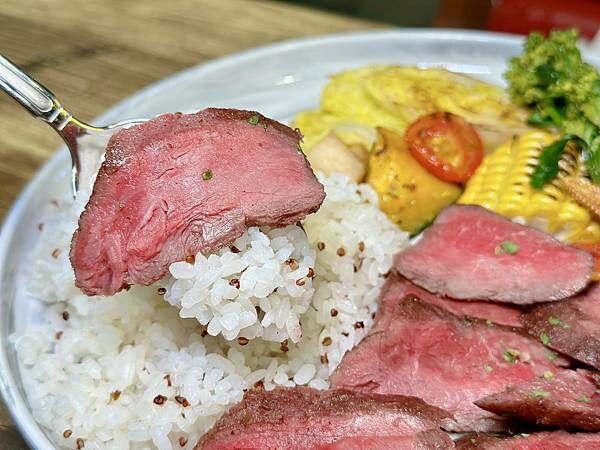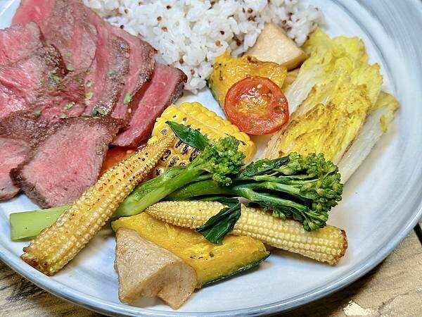 嫩煎的板腱牛肉,搭配烤時蔬,以及殼物米飯