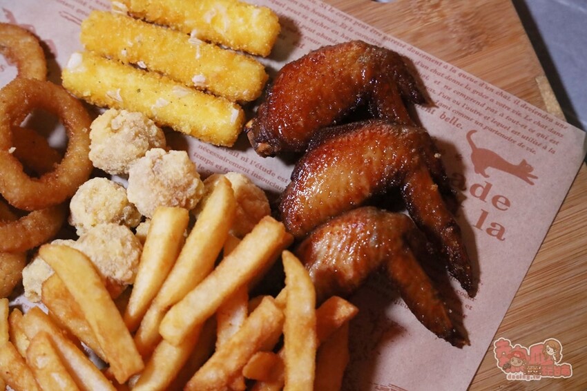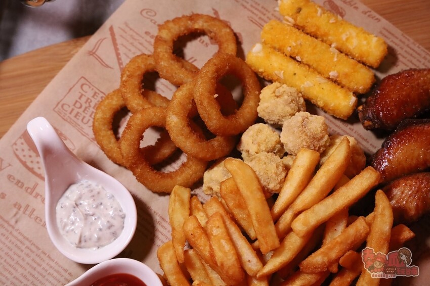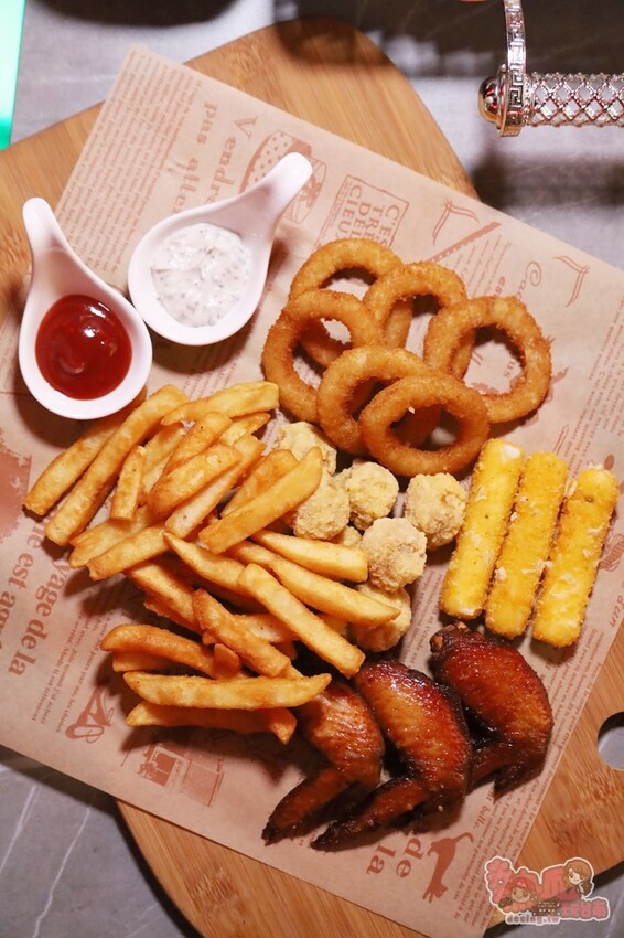 每次來餐酒館,炸物拼盤是我們一定會點的基本款,光是看到各種炸物滿滿盛裝再一起就是爽,內容物包含洋蔥圈、雞米花、起司條、薯條及雞翅,不管是趁熱吃或稍微放涼吃都不錯。