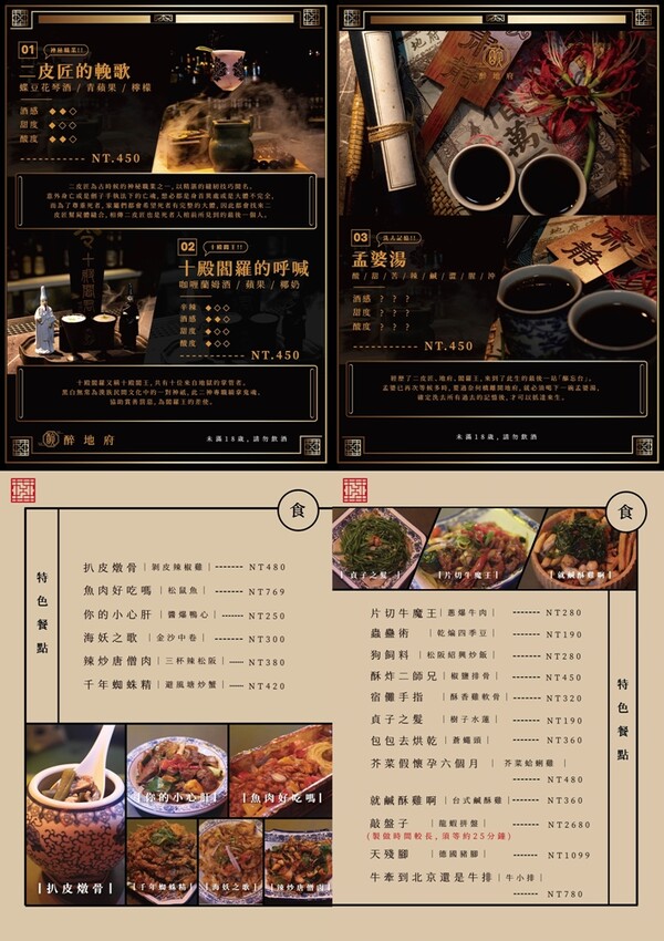 來看看醉地府餐酒館的菜單,在餐點上選擇非常多樣化,即便是2~3人來聚餐也好點菜,個人私心推薦地府辣炒鍋是必點,好吃又好玩。