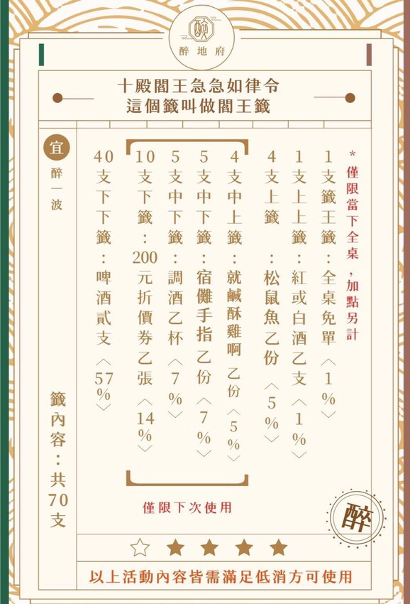 凡該桌消費達5000(皆須滿低消500/人),即可該桌派一人抽生死籤
