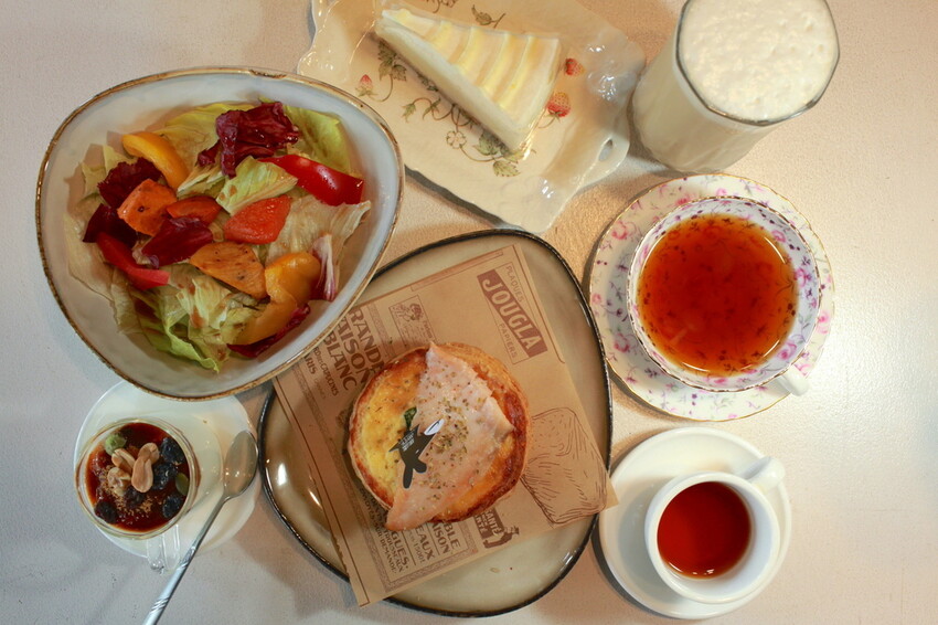 小高今天點原味拿鐵(冰)140元、哥斯大黎加莫札特150元、卜派炙燒鮭魚派160元、沙拉+優格100元(優惠)及檸檬起司蛋糕150元等。