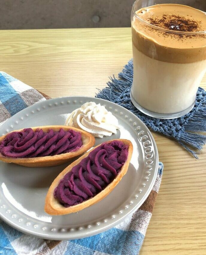 御菓子御殿的紅薯塔(又叫做紅芋塔)非常有名!紅芋其實就是我們說的紫色地瓜,御菓子御殿使用沖繩在地獨有的紫薯來製作,口感綿密不甜膩,除了常溫食用外,烤箱加熱或冷藏也別有一番風味喔!