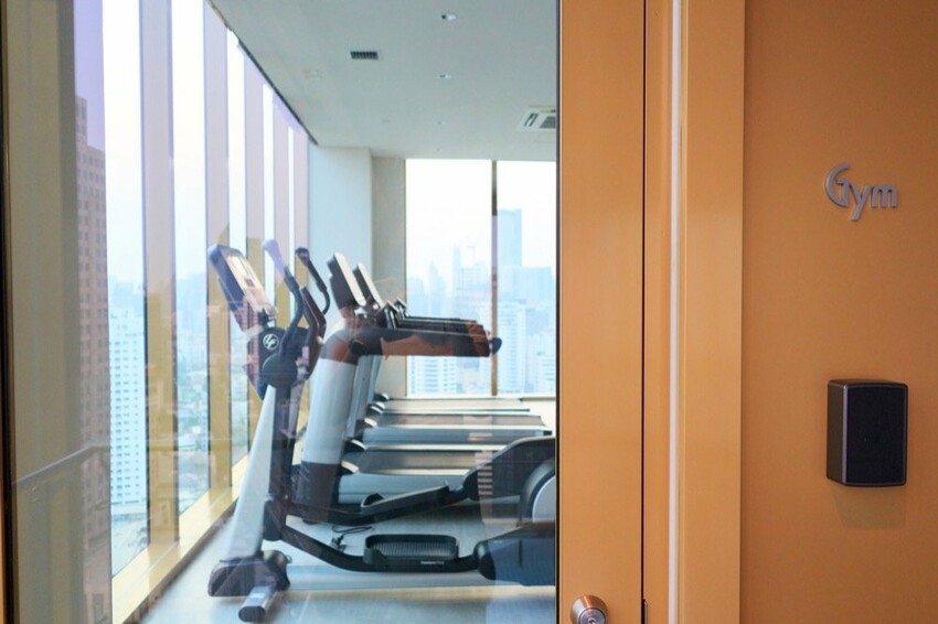 ▼ 健身房也是一樣開到12點,裡面的瑜珈墊、礦泉水、毛巾任取,這裡還有可置物的Locker跟淋浴間,整體來說頂樓公共設施雖然不走網美風,但實際體驗非常好!