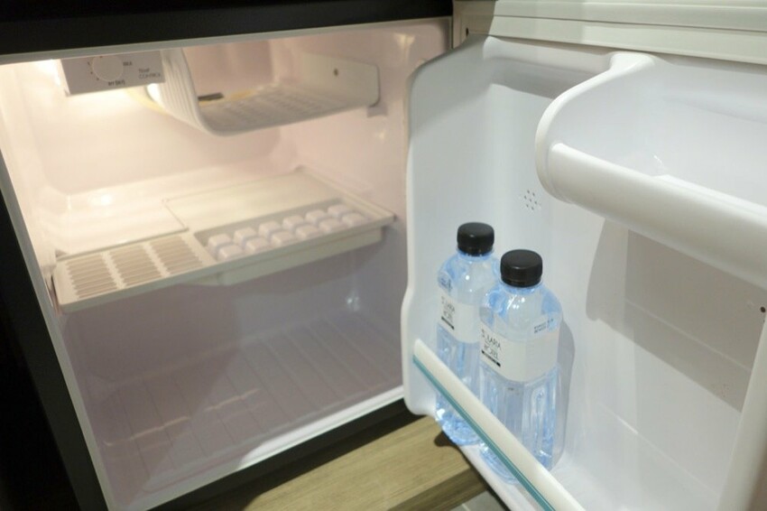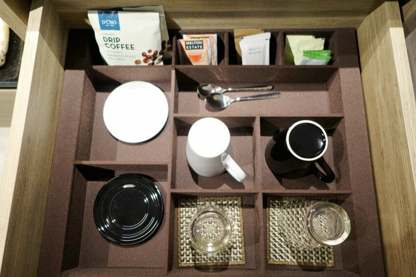 ▼ 小小的Mini Bar,乾淨的煮水壺與茶杯、幾個茶包,小冰箱在下面櫃子裡,我才住一天就給我四瓶水,水挺好喝沒有怪味
