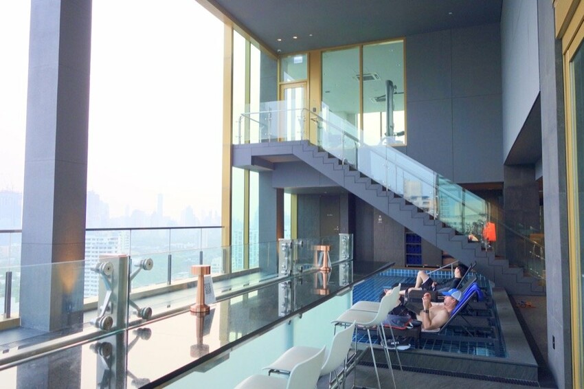 ▼曼谷索拉利亞西鐵飯店的高空泳池,池子不大但是view好好喔!在躺椅上仍然是滿滿的度假感~才開幕3年不到,設施都蠻新的!這裡提供大小條浴巾,不須登記,也有淋浴空間。