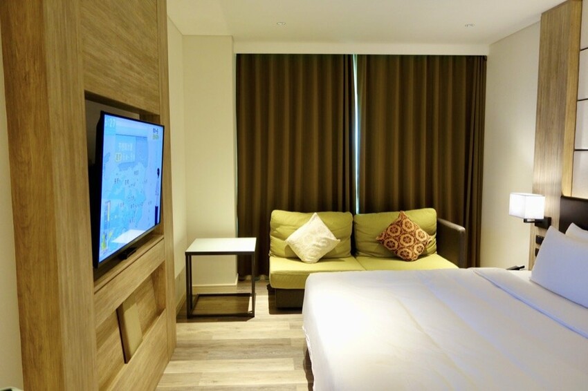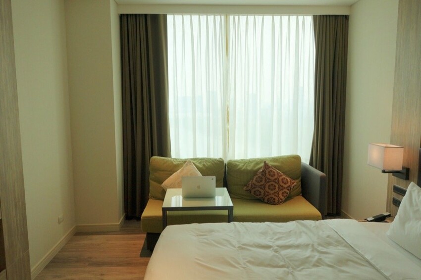 ▼ 房間隔音超級好,我入住完全沒聽到隔壁房的聲音,連開關門聲也蠻少聽到的,加上是高樓層,完全沒有車水馬龍的聲音,房間窗簾有兩層,遮光的程度也很好!