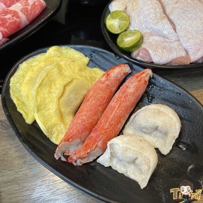 最後特別推薦單點的招牌火鍋料(90元),有日本紅蟳條、三記手工魚餃、手工蛋餃各兩個。