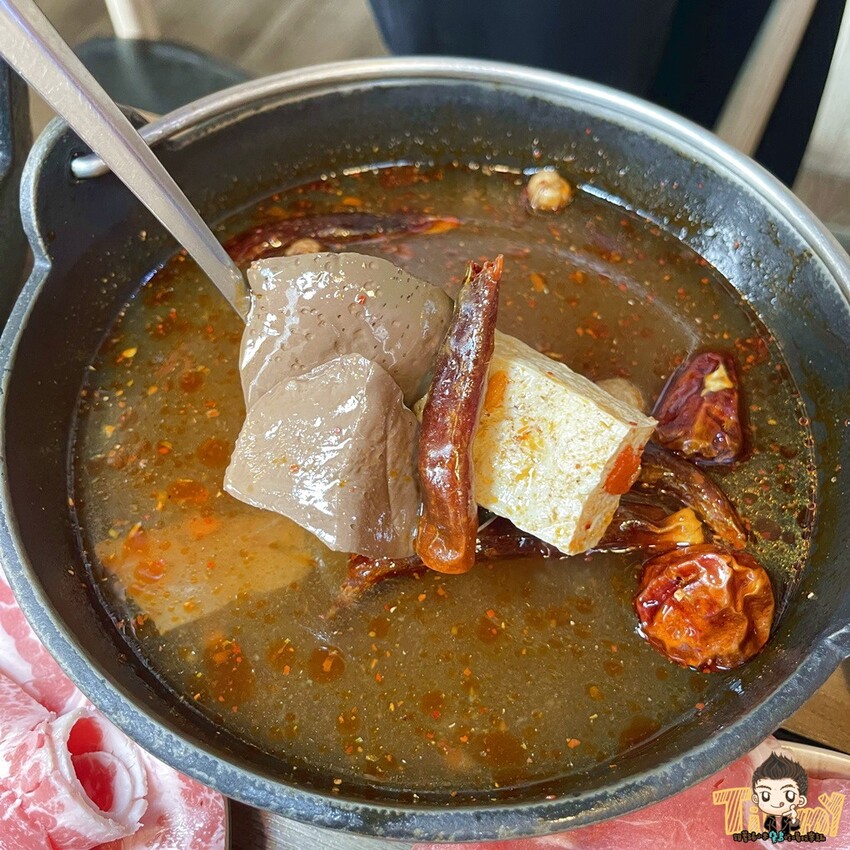 小米也很推川味麻辣湯底(+70元),湯料有鴨血、凍豆腐,湯頭是偏甜小辣的口感