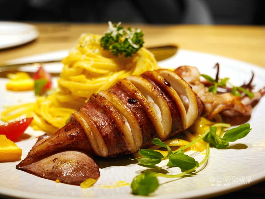 豪邁使用整尾香煎脆甜的Q彈花枝就誘人食慾,寬扁麵均勻沾附上了鹹蛋黃醬。
