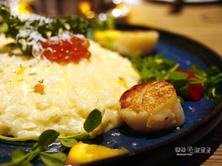 香煎干貝色澤與烹調度正好,啵啵鮭魚卵讓奶白醬燉飯增添了鮮美海味,