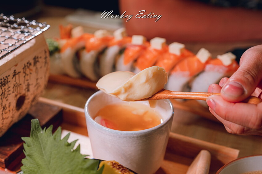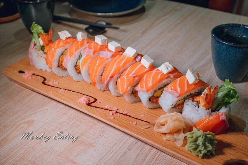 鮭魚生魚片搭配乳酪起司塊風味還挺合拍的,壽司捲裡面有包炸蝦、玉子燒、小黃瓜、生菜等配料,口感很豐富